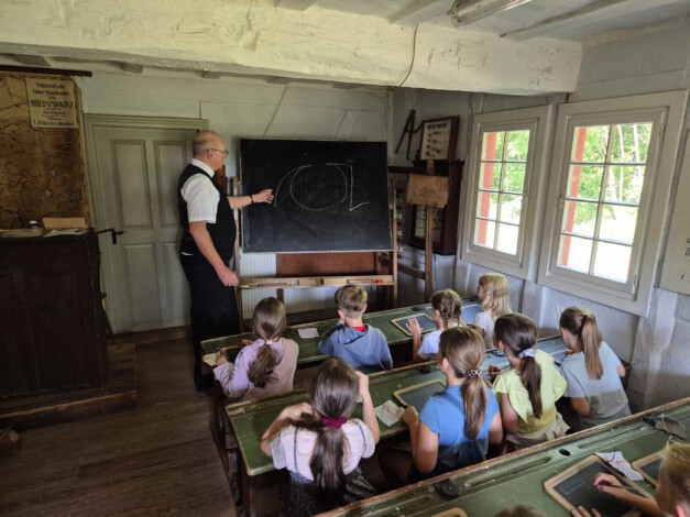 Schule wie vor 100 Jahren – ein besonderer Tag für die Drittklässler Eine ganz besondere Schulstunde gab es im Juni für unsere Drittklässler: Herr Grammes, ehrenamtlicher Mitarbeiter des Freilichtmuseums in Bad Sobernheim lies so manches Kind ein wenig zittern. „Schule früher“ hieß das Programm, dass die Klassen 3a, 3b, 3c und 3d in vergangene Zeiten entführte. Aufrecht sitzen, beide Hände auf den Tisch und die Füße nebeneinander hinstellen. Wer sich höflich meldete und dran genommen wurde, musste aufstehen, geradeaus gucken und in ganzen Sätzen antworten. Mit dem Stock in der Hand lief der Lehrer durch die Reihen. Für Kinder und Lehrkräfte eine nachhaltig beeindruckende Schulstunde. Abgerundet wurde der Ausflug durch freie Zeit auf dem Gelände des Freilichtmuseums, alle Gebäude konnten betreten und das Leben früher bestaunt werden.
