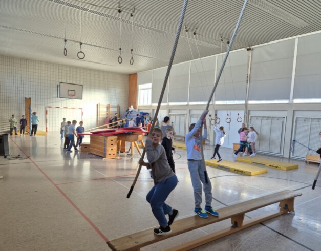 Klettern, Balancieren, Spaß haben – wir machen mit beim landesweiten Bewegungstag So hatten wir unsere Turnhalle noch nie gesehen: ein toller Abenteuerparcours war dort aufgebaut! Schwierige Hindernisse in schwindelerregenden Höhen galt es zu überwinden! Zum Glück standen uns unsere FSJler und die Praktikanten zur Seite und halfen, wenn Hilfe nötig war. Grund des besonderen Tages an der Grundschule Wallhausen: Im Oktober rief die Landesinitiative „Rheinland-Pfalz – Land in Bewegung“ mit der Landesregierung Rheinland-Pfalz, der Sportjugend Rheinland-Pfalz, den Special Olympics Rheinland-Pfalz und dem Behindertensportverband Rheinland-Pfalz zum fünften landesweiten Bewegungsaktionstag Kitas und Schulen auf. Auch wir nahmen teil. Alle Kinder der Grundschule erlebten eine 15-minütige Bewegungseinheit. Besonderen Dank an Frau Raschke für Planung und Umsetzung! Frau Seul und ihre Erstklässler wärmten uns mit einem tollen Tanz auf.