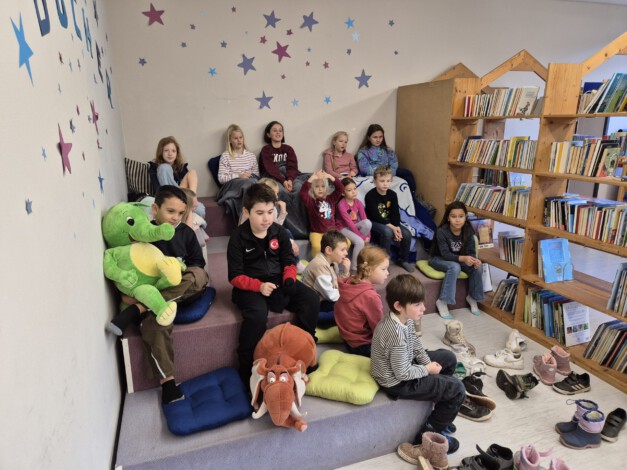 Vorlesetag 2025 Dieses Jahr hatten wir 15 verschiedene Vorleseprojekte unter dem Motto „Alle Sprachen und Schriften sind toll!“. Ein paar der Projekte waren: „Der kleine Prinz“ (russisch/deutsch), „Der Regenbogenfisch“ (englisch/deutsch), „Das Geheimnis von Bahnsteig 13“ (georgisch/deutsch), „Der Grüffelo“ (englisch/schwäbisch/deutsch) und viele weitere tolle Projekte. In den jeweiligen Projekten waren immer ca. 20 Kinder altersgemischt und je eine Lehrkraft sowie eine Helfer*in. Es wurde zunächst in der fremden Sprache gelesen, danach auf deutsch und im Anschluss an das Lesen eine Bastelaktion oä. durchgeführt. Wir als Büchereiprojekt haben vor dem Vorlesetag helfende Leute organisiert (Mamas, Omas, Opas, Tanten), die uns am 21.11.25 unterstützten. Außerdem haben wir die verschiedenen Leseprojekte an unsere 300 Schüler*innen aufgeteilt. Die Kinder konnten sich in einer vorab durchgeführten online Umfrage für ihr jeweiliges Lieblingsprojekt entscheiden. Zu unserem großen Glück hat das LTZ Team „Snacks und Getränke“ uns für den Vorlesetag insgesamt 320 Buchstabenplätzchen gebacken und die sogar portionsweise…