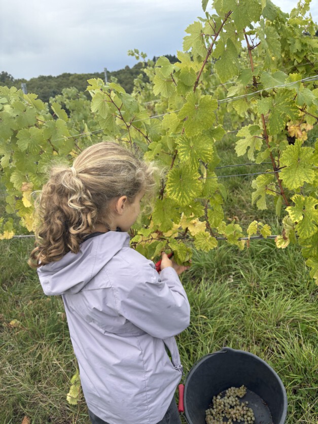 Passend zum Sachunterrichtsthema „Weinbau“ durften unsere 4.Klässler in die Weinlese schnuppern. Im Wallhäuser Wingert des Weingut Mindnich empfingen uns Lara und Lukas (ehemalige SchülerInnen unserer Schule) mit ihren Eltern zur Lese. Mit viel Geduld zeigten sie den Kindern, wie diese die Trauben schneiden und sammeln sollten. Zum Schluss wurden die fleißigen Leser mit einem Picknick belohnt. Wir bedanken uns ganz herzlich für dieses Erlebnis. Die Kinder hatten sehr viel Spaß! Hier einige Berichte der Schülerinnen: „Dort haben wir ganz viele Trauben gelesen und viel Spaß gehabt. Lara und noch jemand hat uns geholfen. Wir haben viel geschafft.“ „In der Weinlese haben wir Trauben gelesen. Das hat viel Spaß gemacht. Man musste aber sehr genau lesen, weil da ganz schön viele Trauben wachsen. Bei den grünen Trauben dauert es länger als beiden lilanen, weil sie sind besser zu sehen. Aber trotzdem macht es Spaß, die grüne Trauben zu ernten Die Weinlese…