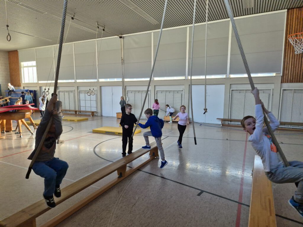 So hatten wir unsere Turnhalle noch nie gesehen: ein toller Abenteuerparcours war dort aufgebaut! Schwierige Hindernisse in schwindelerregenden Höhen galt es zu überwinden! Zum Glück standen uns unsere FSJler und die Praktikanten zur Seite und halfen, wenn Hilfe nötig war.